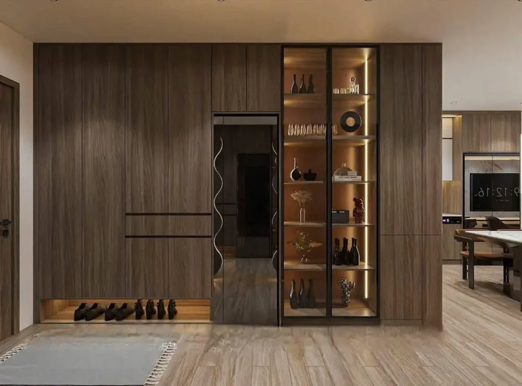 Bạn có thể chọn bố trí bàn thờ ngay vị trí cần cửa ra vào và có vách ngăn với phòng khách để giúp tiết kiệm không gian cũng như giúp ngôi nhà khang trang hơn. Tuy nhiên, bạn cần lưu ý chọn chất liệu gỗ phù hợp với màu cửa, nền nhà, kệ tủ… để tạo nên sự hài hòa cho căn phòng.