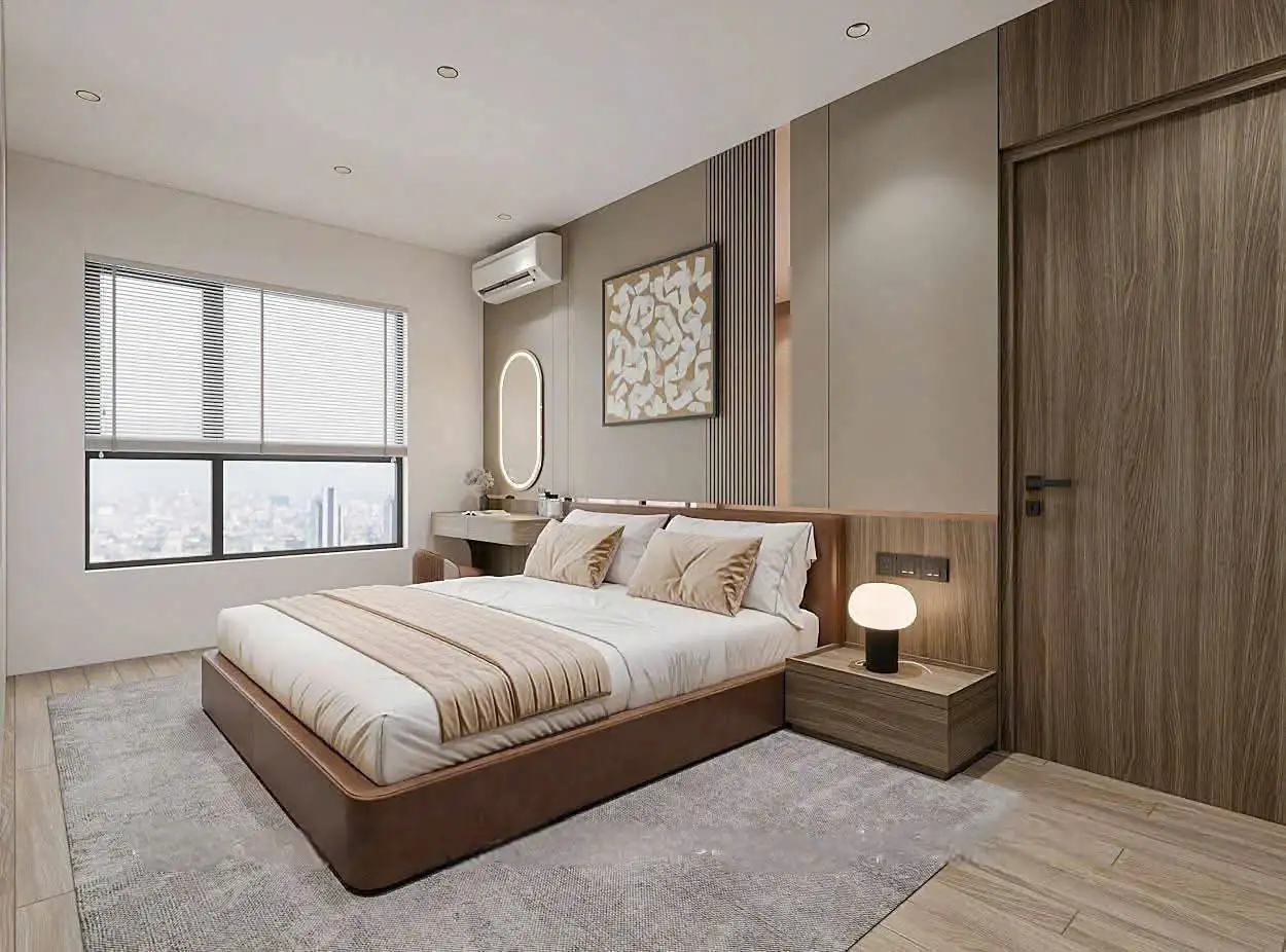 Sử dụng nội thất đồ gỗ luôn khiến bất kỳ ai phải mê mẩn bởi đường nét sang trọng, tinh tế từ vân gỗ, màu sắc. Lựa chọn tone màu trắng làm chủ đạo cho toàn bộ căn nhà, tủ gỗ, giường gỗ, sàn gỗ và bàn ghế là điểm nhấn ấn tượng khiến người xem phải cuốn hút hay từ ánh mắt đầu tiên. Thiết kế nội thất chung cư với những hình khối vuông vức khiến cho không gian thêm khỏe khoắn, gọn gàng.