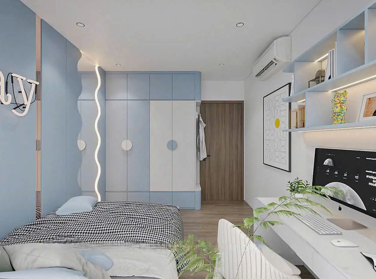 Để mở rộng không gian cho căn phòng, phòng bếp và phòng khách được nối liền nhau và bày trí theo concept hiện đại, sang trọng và tinh tế. Sử dụng các chất liệu cao cấp như gỗ, đá, nỉ, dạ cùng hệ thống đèn chiếu sáng sang trọng gợi nên sức hấp dẫn, lôi cuốn mạnh mẽ. Đối với phòng ngủ cho bé, kiến trúc sư đã bày trí không gian vừa đáng yêu, thoải mái cho bé học tập và nghỉ ngơi.
