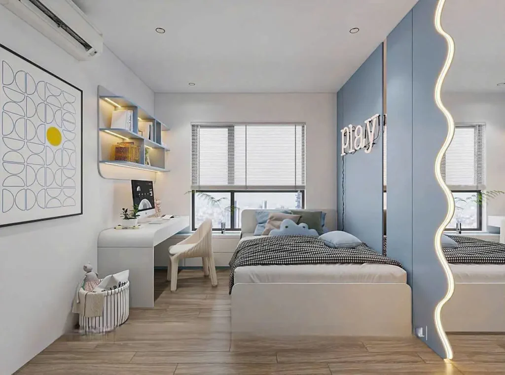 Để mở rộng không gian cho căn phòng, phòng bếp và phòng khách được nối liền nhau và bày trí theo concept hiện đại, sang trọng và tinh tế. Sử dụng các chất liệu cao cấp như gỗ, đá, nỉ, dạ cùng hệ thống đèn chiếu sáng sang trọng gợi nên sức hấp dẫn, lôi cuốn mạnh mẽ. Đối với phòng ngủ cho bé, kiến trúc sư đã bày trí không gian vừa đáng yêu, thoải mái cho bé học tập và nghỉ ngơi.